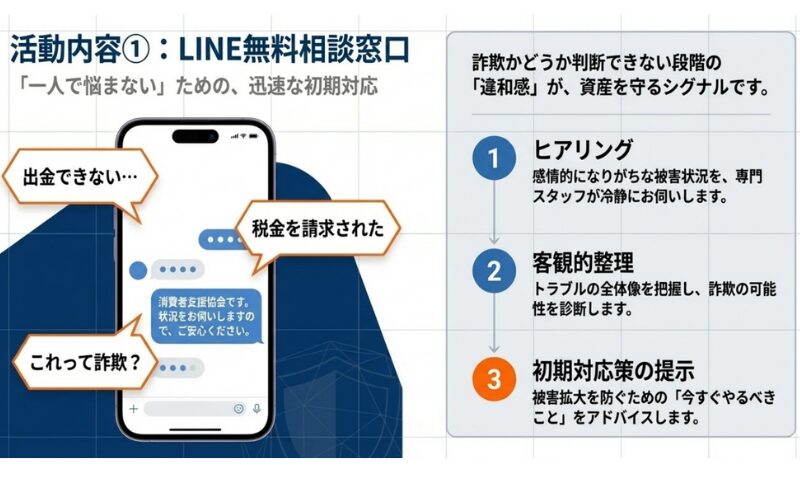 仮想通貨詐欺の可能性や被害の状況返金の可能性など、専門スタッフが丁寧にお話を伺います。